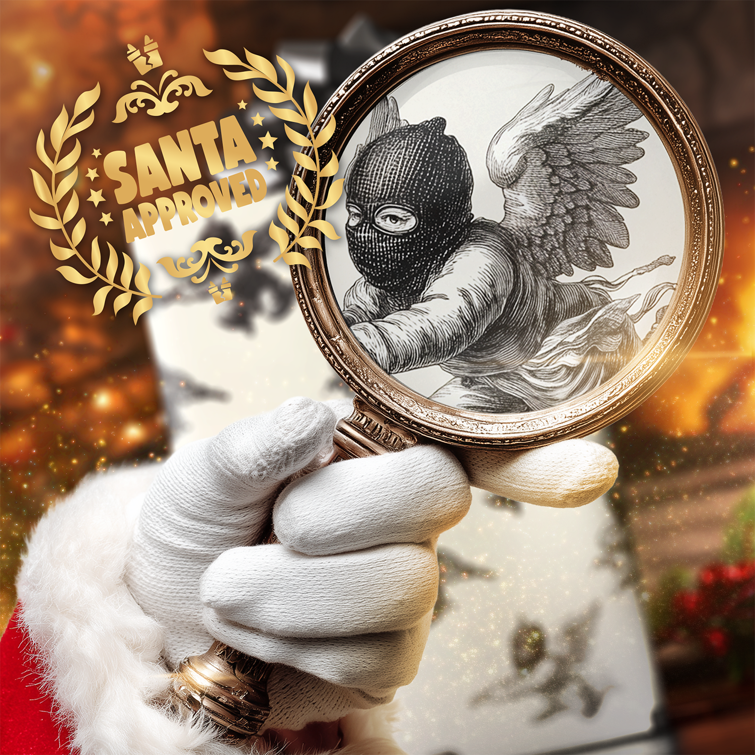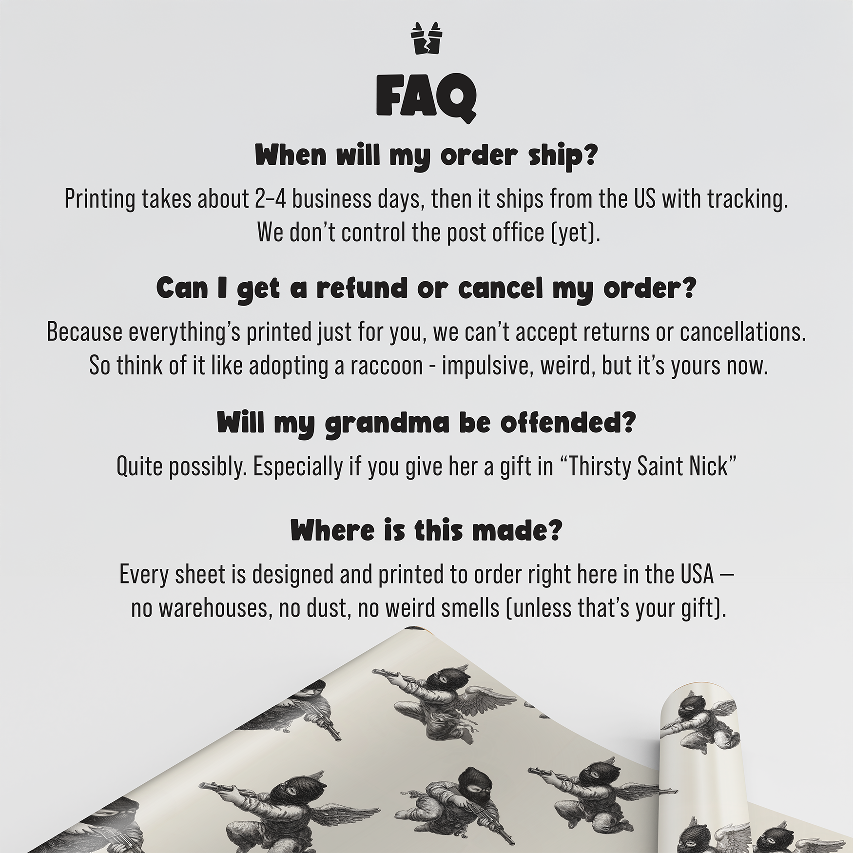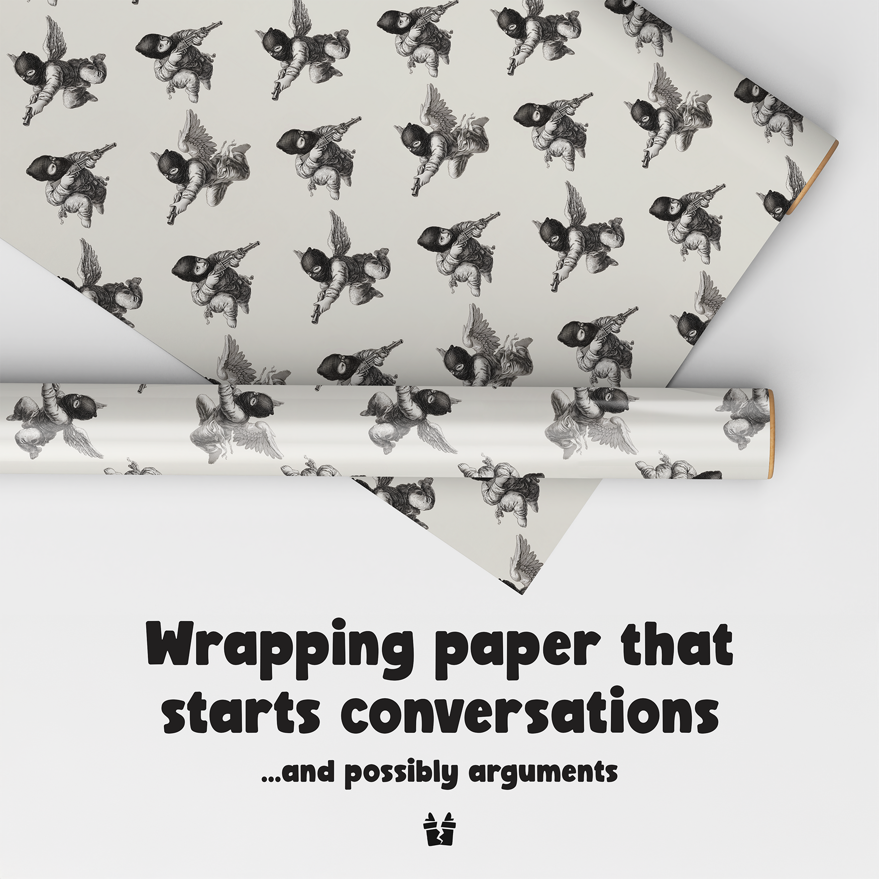 A festive pattern where cherubs show up locked and loaded like they’re protecting the North Pole’s last nerve. Edgy Christmas wrapping paper featuring vintage cherub illustrations with weapons - perfect for those searching for dark holiday gift wrap with chaotic humor.