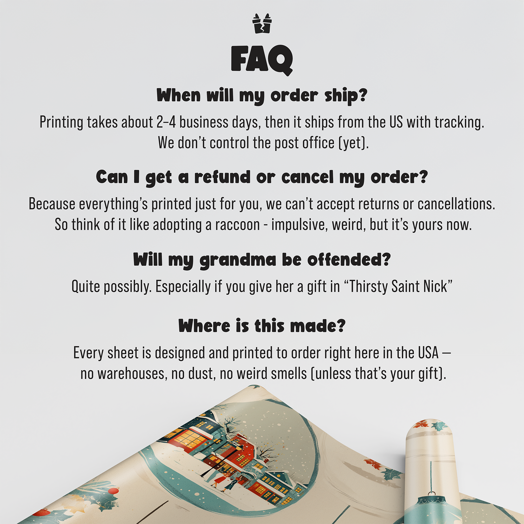 Wrap like there’s no tomorrow with our high-definition prints on luxurious 90gsm fine art paper - because no gift should go unnoticed. Whether it’s Christmas, birthdays, or any special occasion, these stunning papers add a festive flair that’s anything but ordinary. Choose from glossy or matte finishes for that perfect final touch, ensuring your gifts make an unforgettable first impression. With a variety of sizes, you’ll always have just the right fit for any gift, from stocking stuffers to statement packages. Perfect for those who appreciate the art (and chaos) of gifting, these wraps are ready to elevate every celebration - from wild family gatherings to those 'friendly' exchanges that demand extra flair. Disclaimer: Due to the nature of printed products - colors, hues, and saturation may appear slightly different on printed products compared to promotional photos. I've done my best to represent them as accurately as possible! Product features - High-definition print quality - Choose between glossy or matte finish - Made from durable 90gsm fine art paper - Available in three versatile sizes - Sourced from quality materials in Germany. - Printed and designed in the USA.