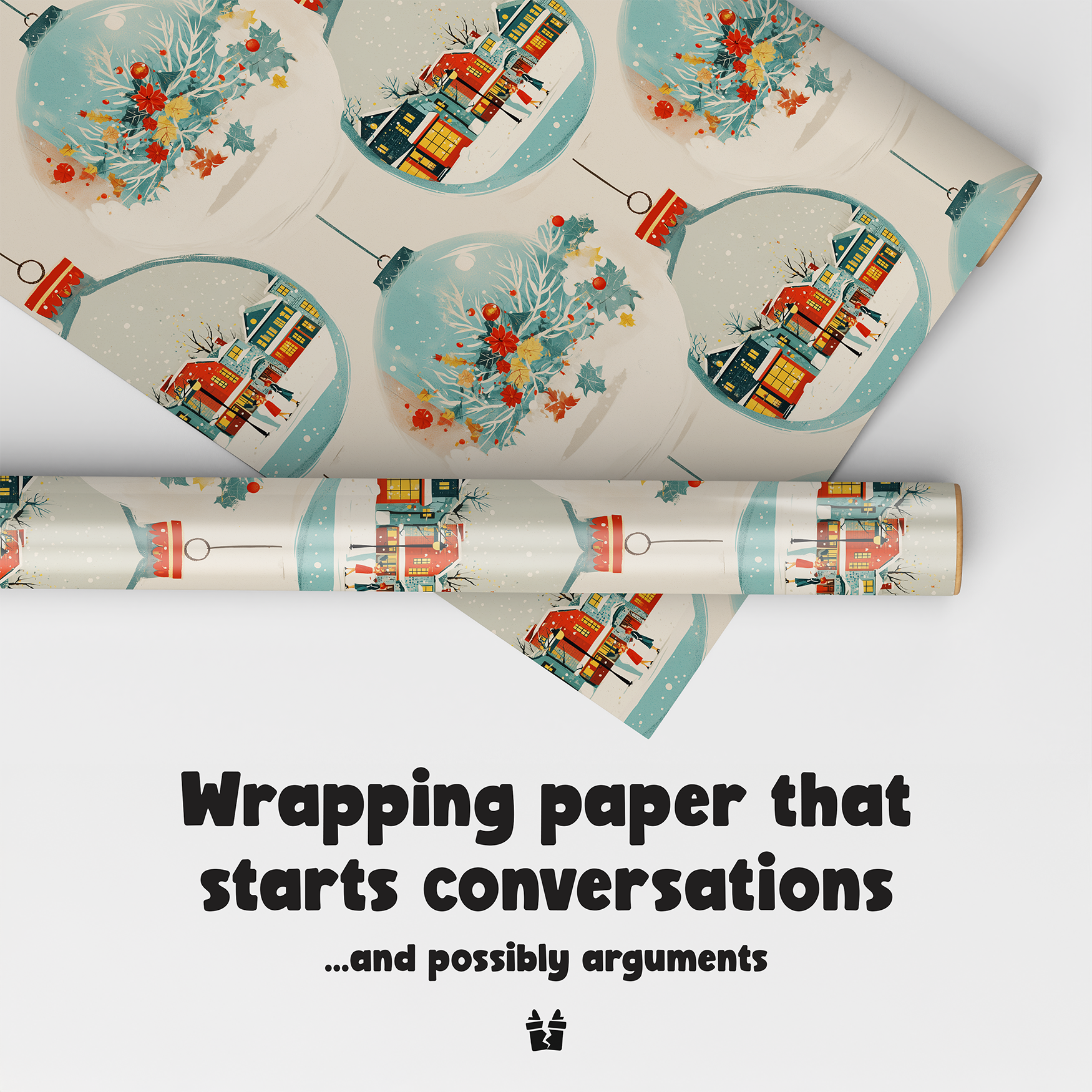 A whole cozy winter village trapped inside ornaments like a decorative snow-globe hostage situation - but hey, it looks charming. This retro Christmas wrapping paper features vintage snow-globe scenes, classic holiday houses, and nostalgic winter details, giving gifts that warm, old-movie holiday aesthetic people search for nonstop in December.